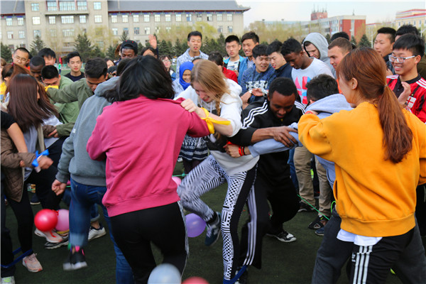比赛形式采用自由组队,分为红、黄、蓝、绿四支队伍,共包含螃蟹赛跑、拔河、气球爆破、时空隧道、摸石过河、呼啦圈过山车、跳长绳等七个项目的比拼。中外学生之间虽然肤色不同,语言交流也不十分流畅,但丝毫没有影响他们在比赛中团结一致、积极配合,整场比赛中,军工操场洋溢着中外学生的欢呼声与笑声。此次运动会中外学生共同承担了前期准备、赛事组织等任务,在这些工作中大家互帮互学,建立了深厚的友谊。比赛现场,所有参加的同学建立了一个大微信群,200余名参加趣味运动会的中外同学加入到微信群,赛后继续讨论着比赛中的快乐回忆,并相互分享照片。