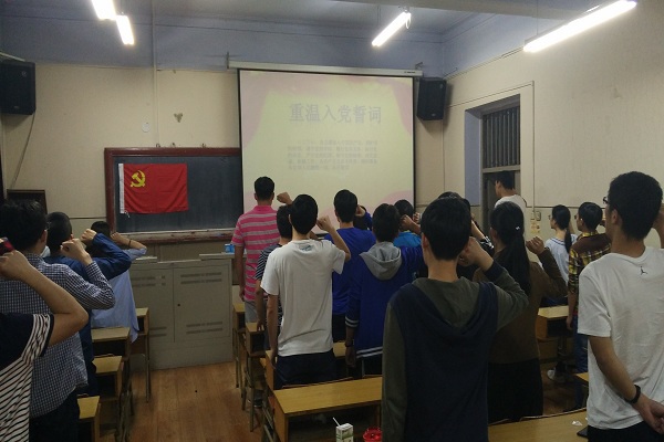 活动伊始,各支部全体党员在15硕2班党支部书记吴连竟的带领下重温入党誓词,共同讨论了习总书记关于教育工作的重要讲话,多数党员结合自身实际情况畅所欲言。老党员张琦表示希望各位党员能不忘初心,按照“四讲四有”标准严格要求自己,积极钻研科学知识,做“勤学、修德、明辨、笃实”的表率,现场气氛十分热烈。
