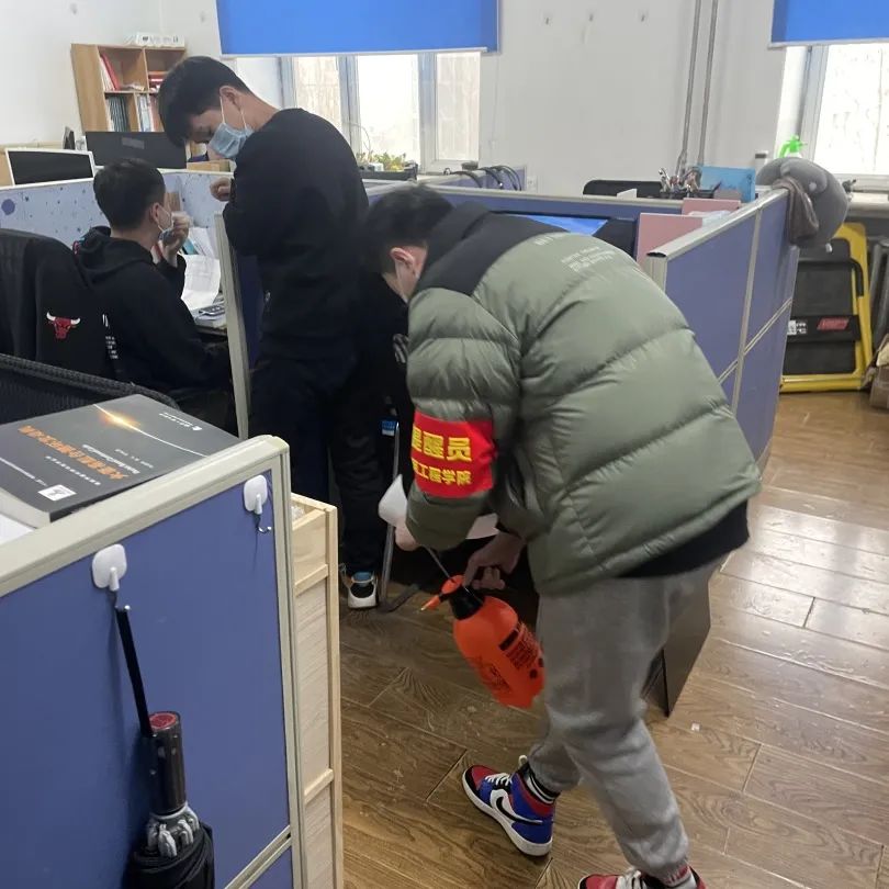 巡查队兵分五路对各个楼层的研究生工作室进行消杀,同时对没有佩戴口罩的同学进行监督规劝。