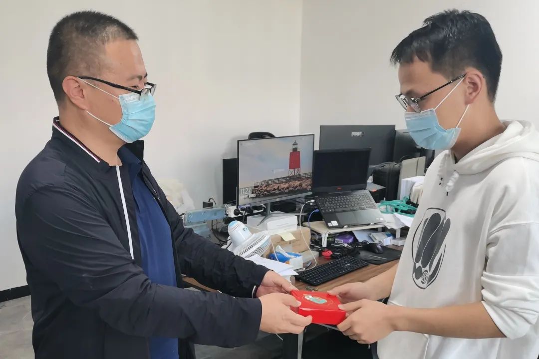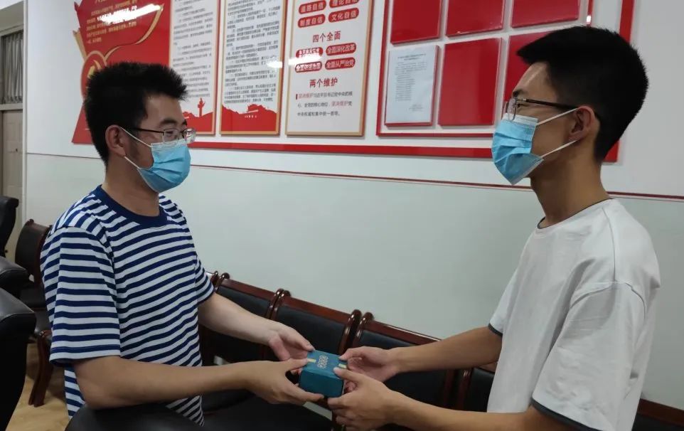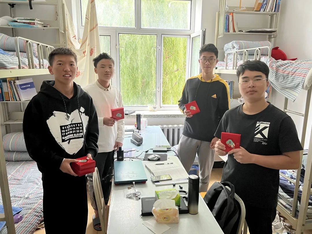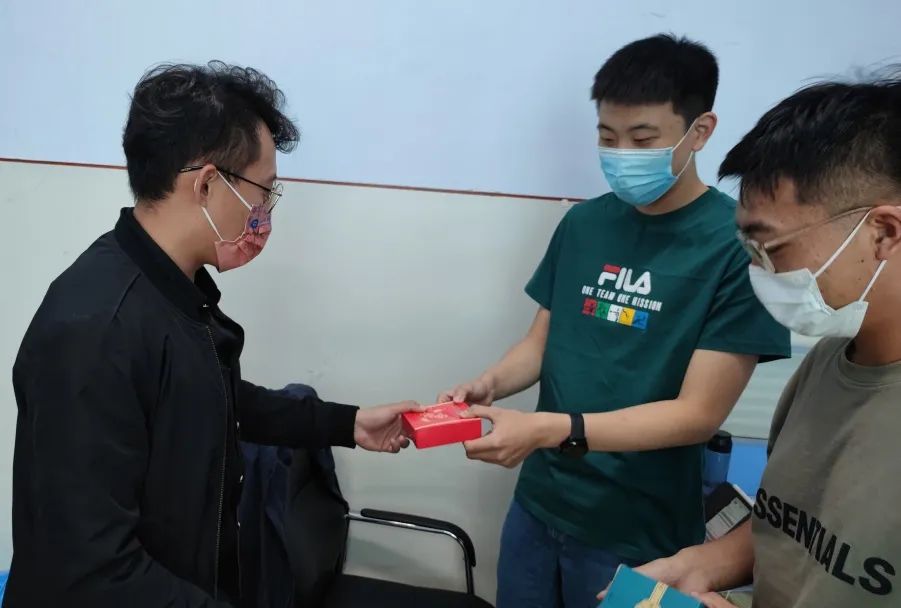 9月8日,航建学院新生辅导员高明、程业强、刘广谦、王臻汉及军训指导员冯庆为同学们送上祝福和代表着团圆和睦、和谐美满的中秋月饼。