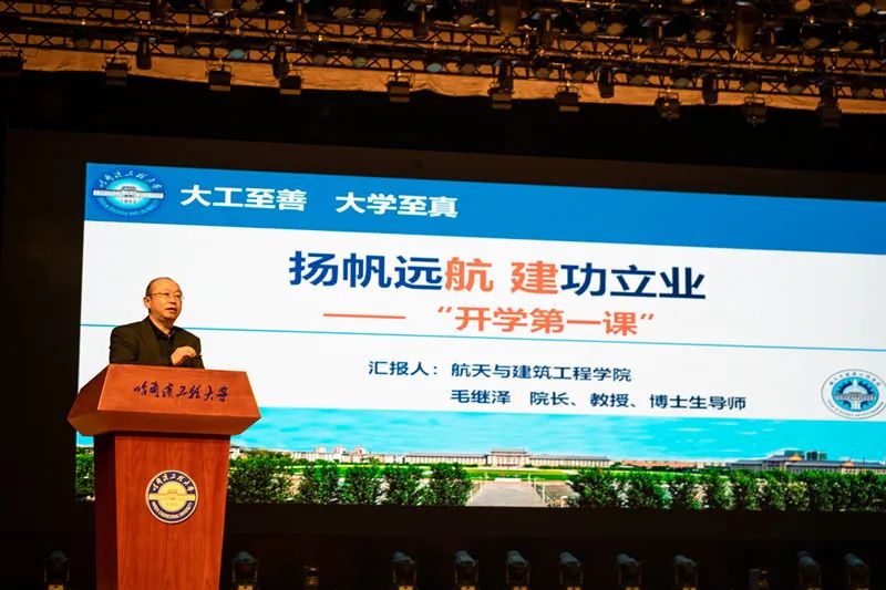 开学典礼中,院长毛继泽为大家讲授了开学第一课。毛继泽从学校、学院、学科、学生等几个方面,通过详实地数据对比和具体事例的列举,细致地为同学们讲解了学校、学院的发展和建设情况,以及校友在国防科技和国家经济建设各个领域所做出的突出贡献,激励全体新生在大学最美好时光中找到自己的目标,将“小我”融入“大我”, 把“自己的梦”融入“中国梦”,高扬理想信念旗帜,在奋战新征程、建功新时代中磨炼意志,在实现民族复兴的赛道上奋勇争先。