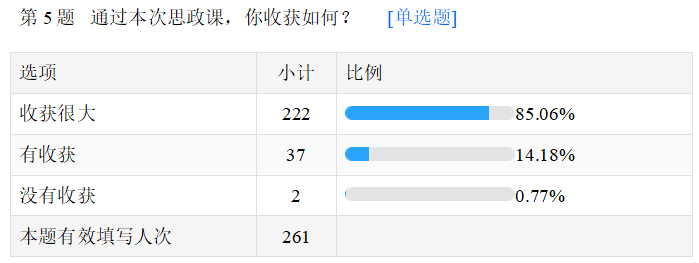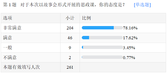 通过即时调查可以发现,95.78%的学生对于本次以故事会形式开展的书记联合思政课表示满意或非常满意,99.24%的学生对本次以故事会形式开展的书记联合思政课表示有收获或收获很大,也有同学提出希望面对面聆听优秀学长的成长故事、增加师生互动环节等建议。学院将及时了解掌握学生课后收获和感受,根据学生的反馈,不断完善新生思政第一课的内容和形式,着力将其打造成思政教育品牌。