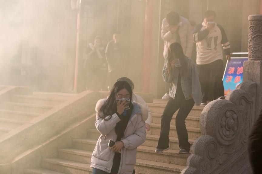 会后,全员进行火灾疏散逃生的实战演练,参演教职工、学生在消防疏散员的引导下,用湿毛巾捂住口鼻,低头弯腰、单列靠右,迅速按照疏散通道方向,安全有序地疏散到指定区域。
