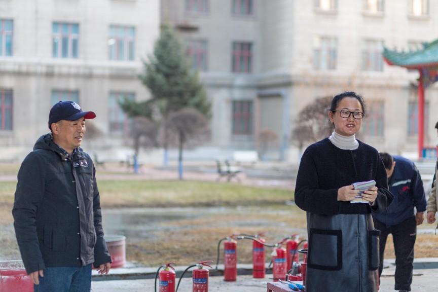 安全撤离后,学院领导、各部门教职工和学生在11号楼南门一侧区域参加灭火器使用培训并亲手实践,学校安全保卫处叶远康老师为大家示范如何正确使用灭火器、掌握扑灭初期火灾的方法。