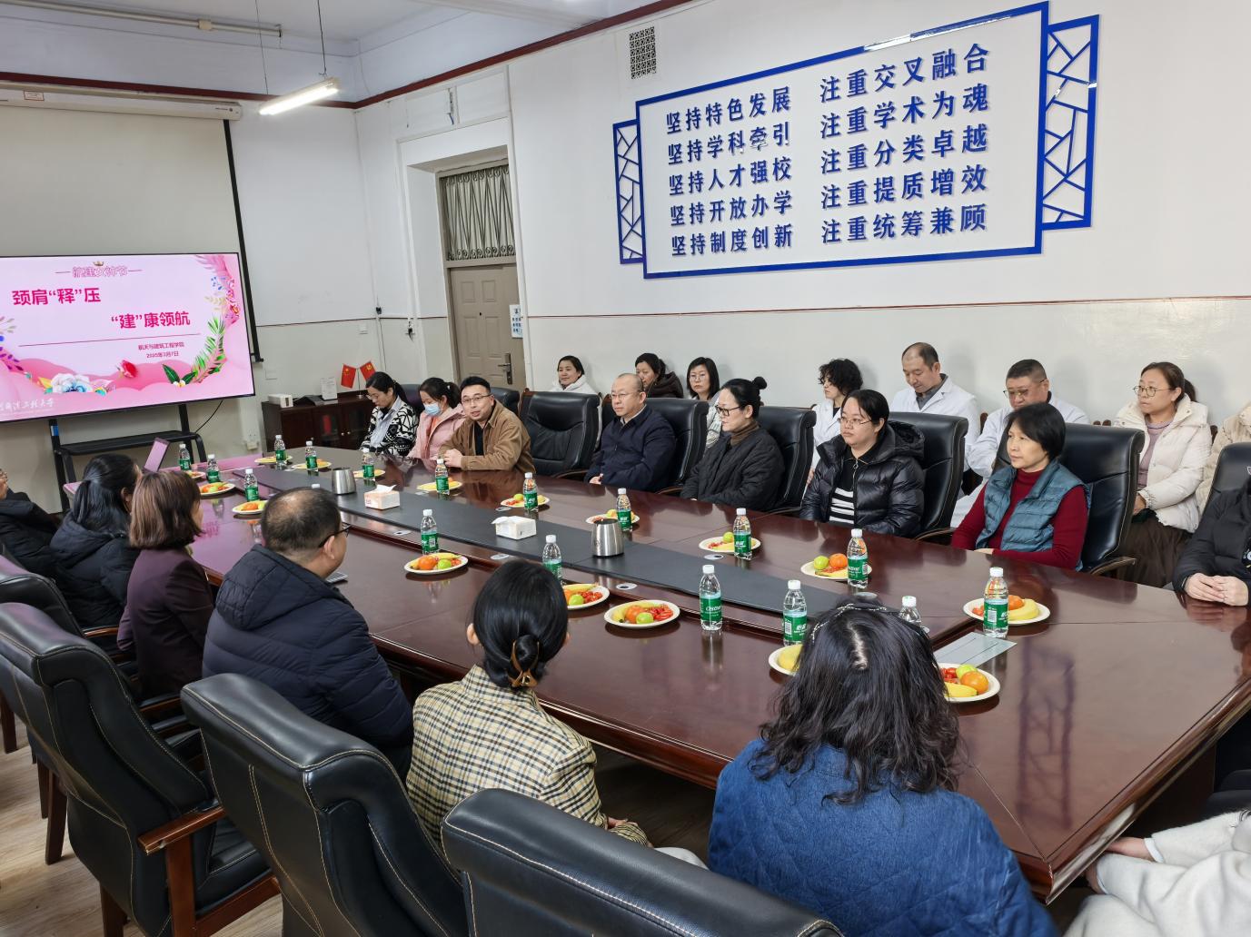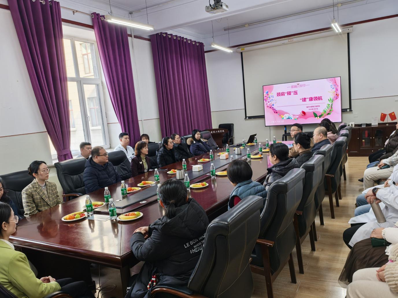 3月7日下午14:30,航建学院在11号楼3067室庆祝一年一度的“三八”国际妇女节的到来,特别邀请校医院中医科诊疗团队,为女教职工们的颈肩健康保驾护航。校医院党委书记金声、院长兰凯、学院领导、女教职工代表参加活动,活动由学院党委副书记安沛旺主持。