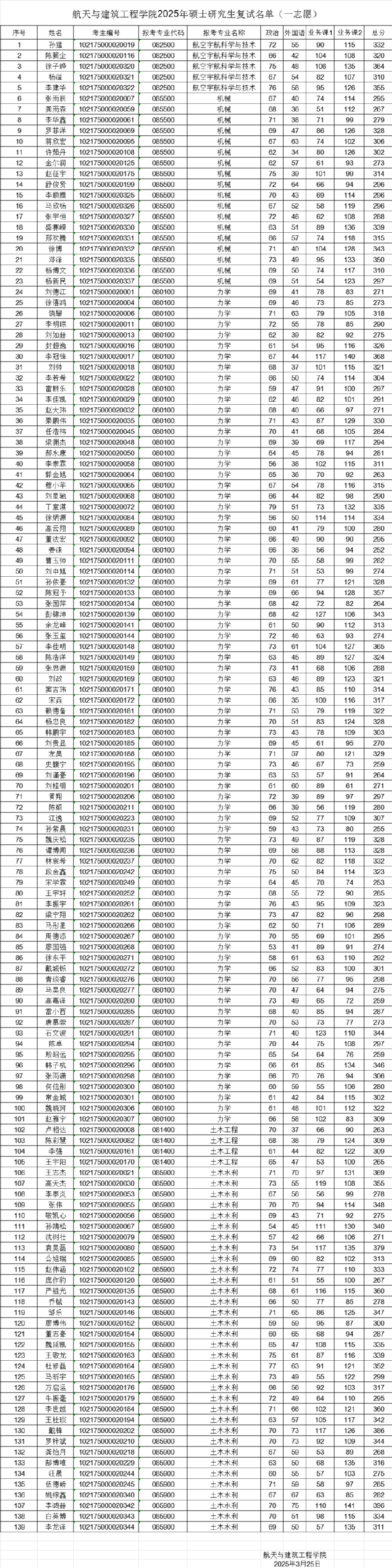 OK138太阳集团2025年硕士研究生复试名单(一志愿)